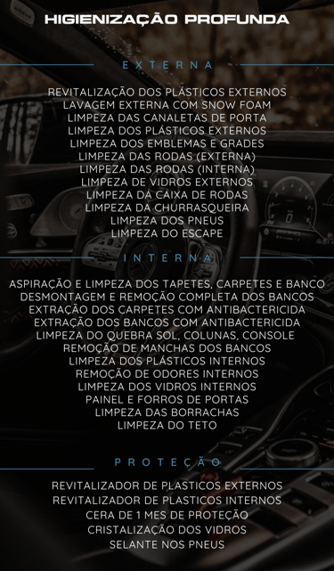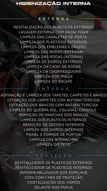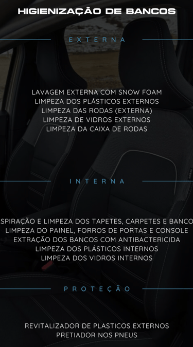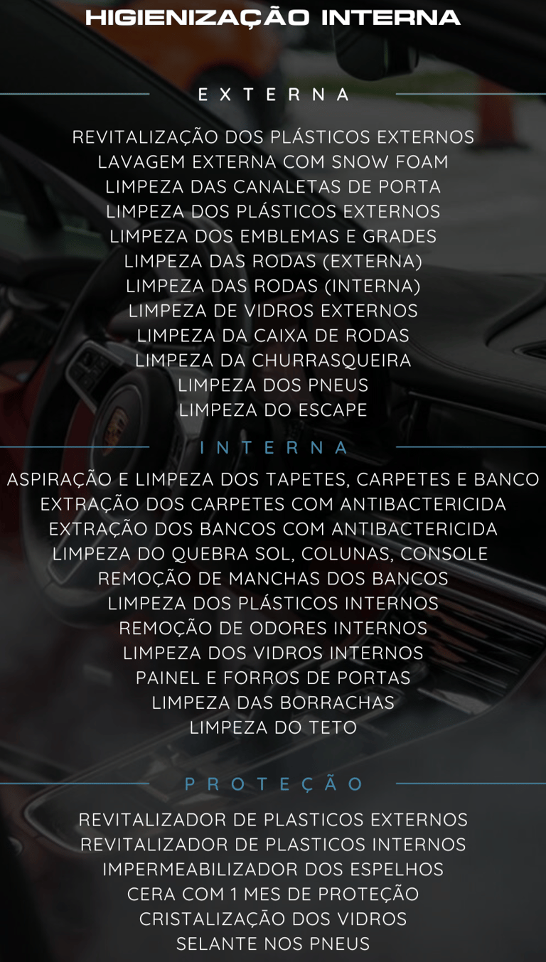 Nosso serviço de Full Detailing entrega um carro completamente renovado, desde a pintura impecável até o interior limpo e protegido, garantindo uma experiência premium.