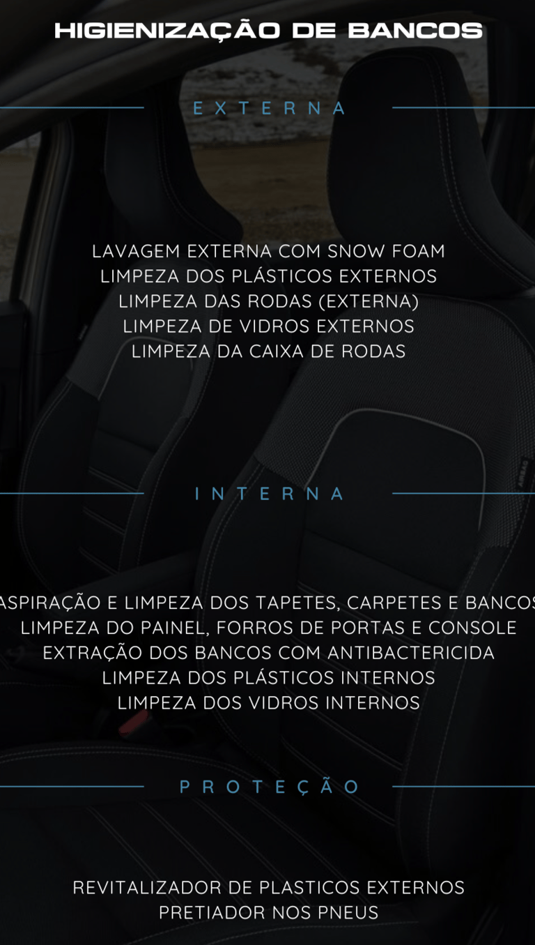 Oferecemos um serviço completo de higienização com tecnologia de ponta, que limpa profundamente cada detalhe do interior do seu veículo, eliminando ácaros, bactérias e odores. Cada aplicação é realizada por especialistas, garantindo máxima proteção, conforto e satisfação.